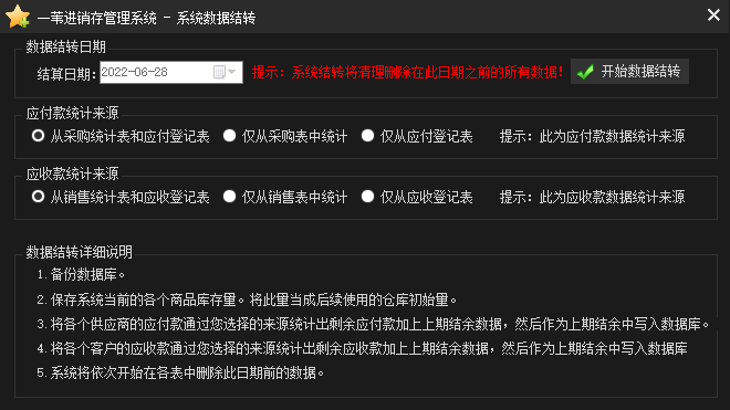 当系统运行时间过长时,可以利用此功能重新清空数据库中的部分数据空间。此功能仅会结转各供应商 和客户的款项信息 主要是应付和应收款结余。保留系统中的基础信息 然后删除各单据表单据商品详情表中的数据。 单机版时会自动备份数据库,网络版则必须在管理员的配合下使用。慎用!!!